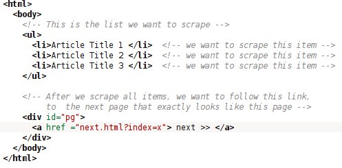 Let’s assume we’ve a site called example.com. Example.com lists 10 items – say articles – per page, with a next link at the bottom – except for the last page off course. We want to scrape article titles across all pages.  Below is the HTML of the pages we want to scrape
